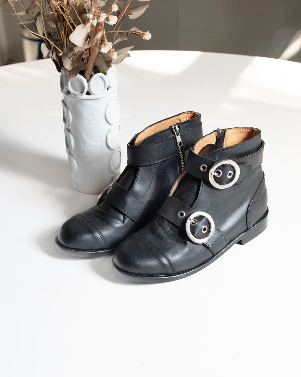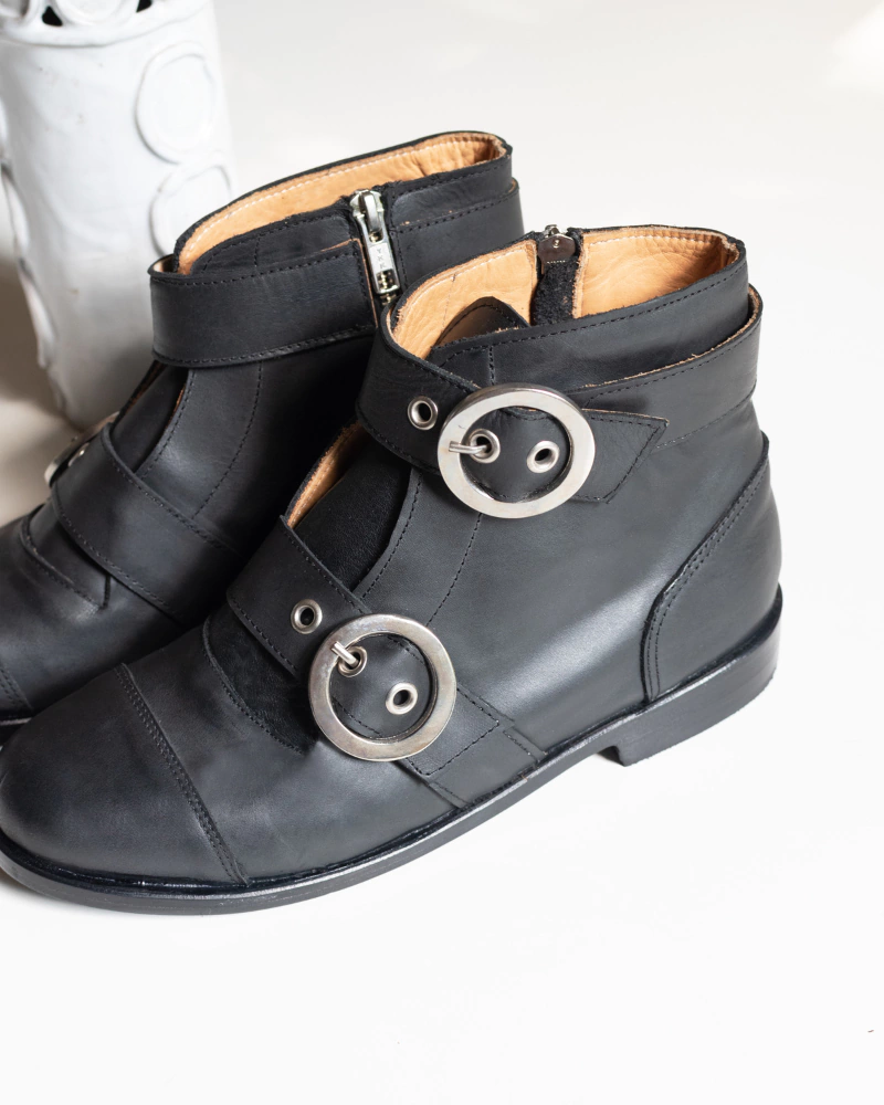 p>Botienta de 100% cuero vacuno , interior exterior, de color negro y caña de 12cm desde el talon. Acceso con un cierre metalico YKK, de un lado y con dos hebillas. Ideales para las cuatro estaciones. Hecho en argentina, producto artesanal.