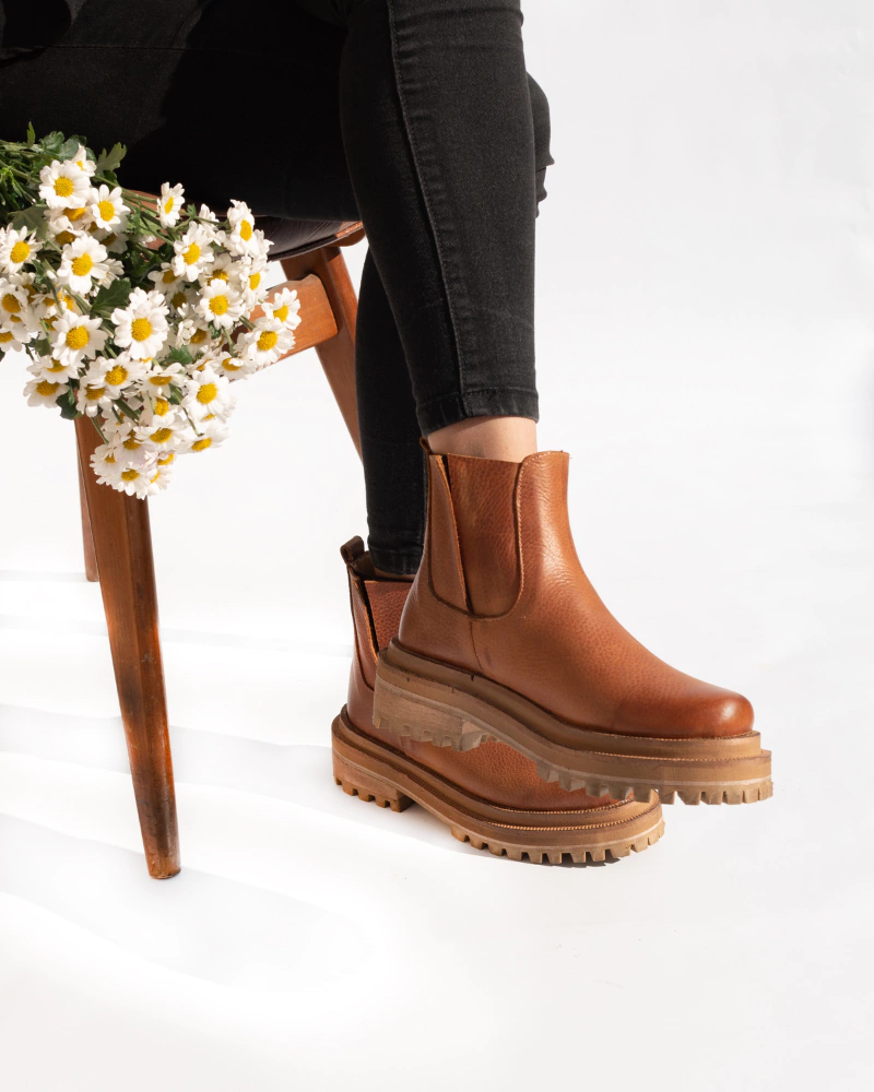 Bota de cuero color suela, con elastico forrado de cuero. Base artesanal de eva de 5 cm y caña de 12cm desde el talon. Súper cómodos y livianos. 100% cuero y producto artesanal.