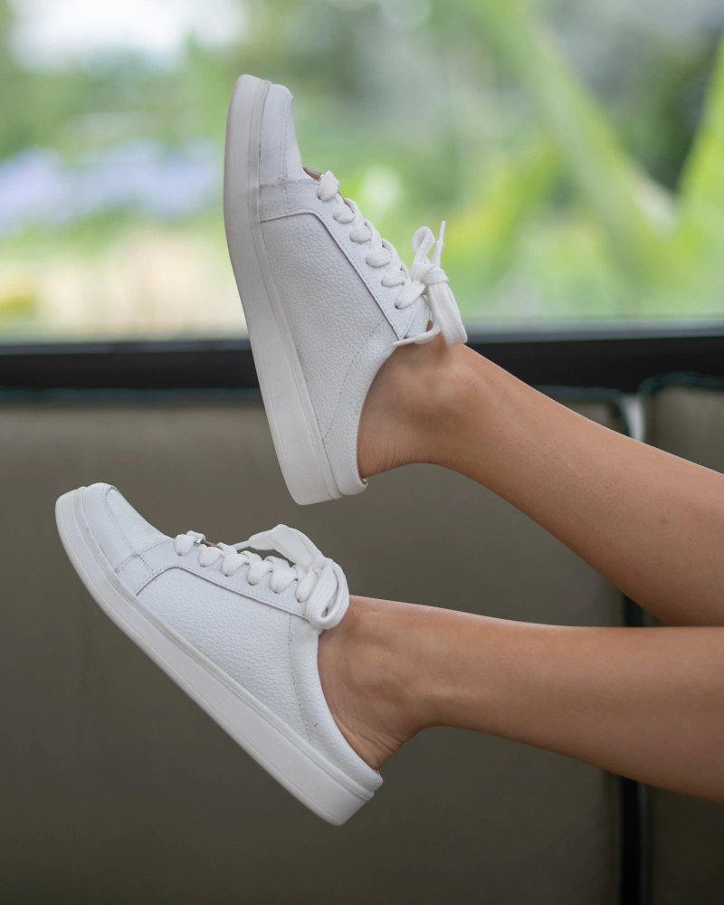 Zapatilla 100% cuero floater blanco sin talón. Con base TR de goma liviana de 2,5 cm. Súper cómodas.