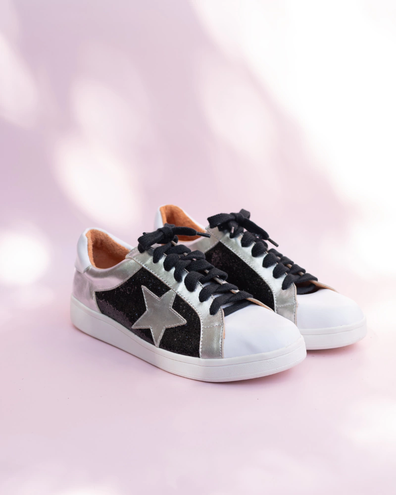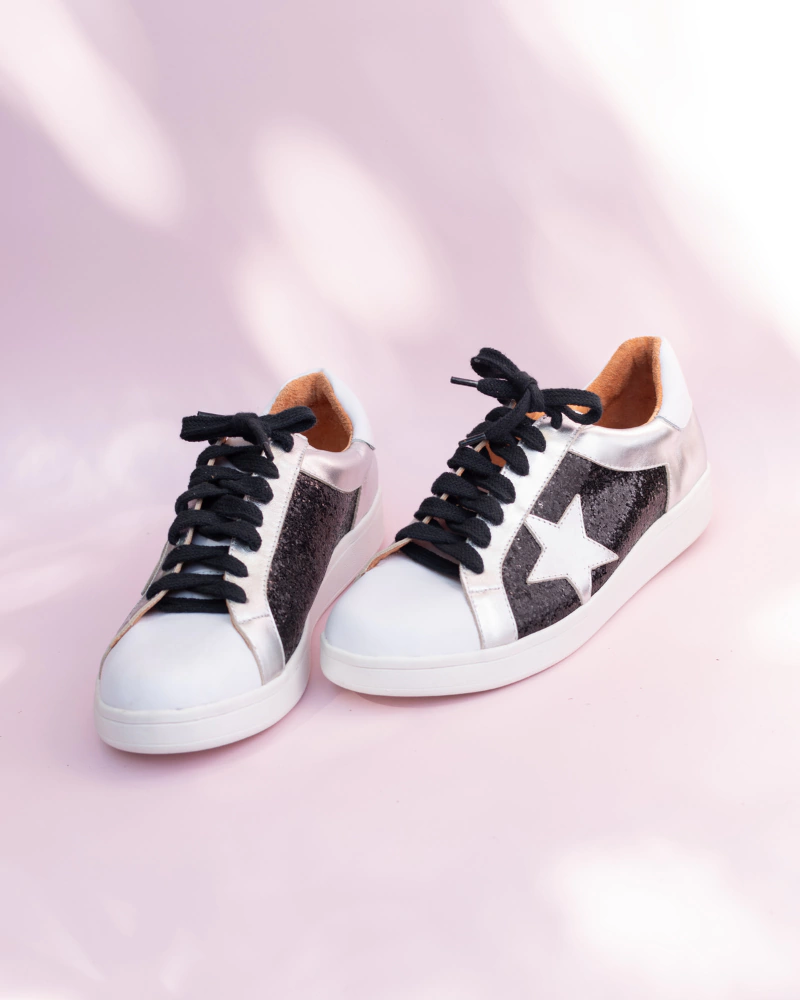 p>Zapatillas 100% cuero vacuno. Exterior color blanco liso, interior color brandy con recortes en plateado, blanco y glitter negro. Interior y exterior de cuero. Con estrella bordada en plateado en un costado. Base TR de goma liviana de 2,5 cm. Súper cómodas.