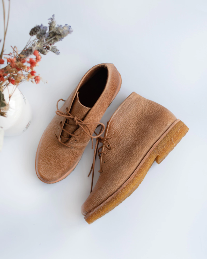 Zapato abotinado acordonado, 100% cuero vacuno, interior exterior color brandy. Con base crep de 2cm y caña de 10cm desde el talon.
