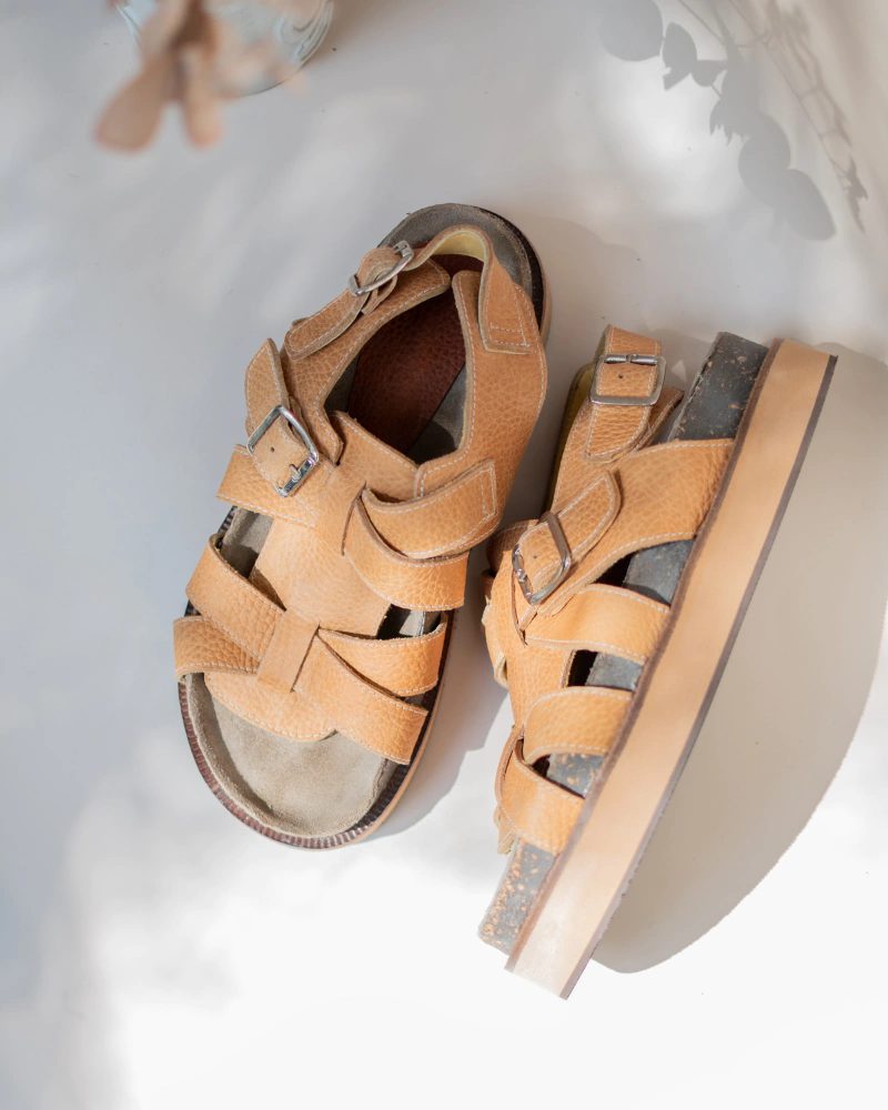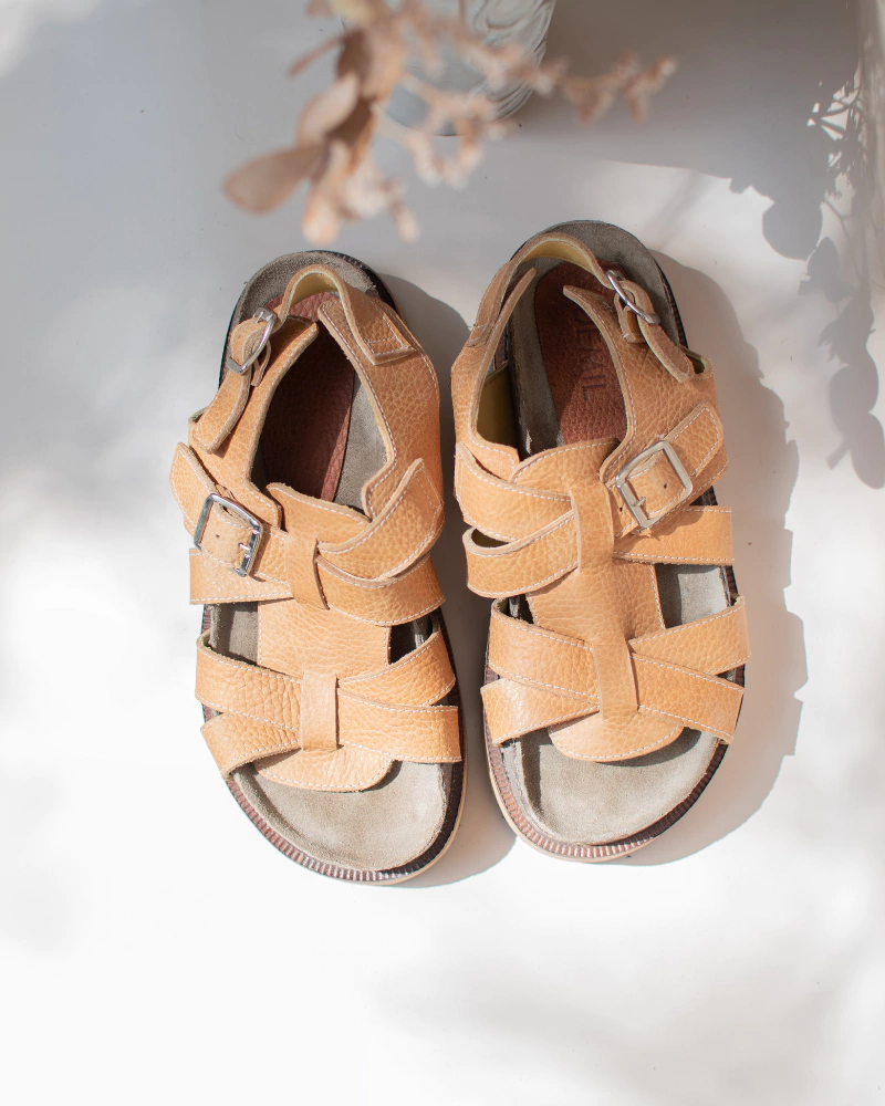 Sandalias 100% cuero en color brandy con plantilla birk forrada en gamuza y base de eva de 2 cm con suelín de punta de diamante.