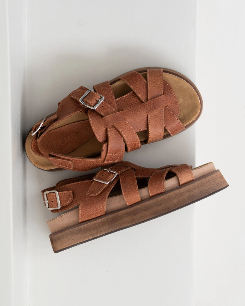 Sandalias 100% cuero en color suela con plantilla birk forrada en gamuza y base de eva de 2 cm con suelín de punta de diamante.