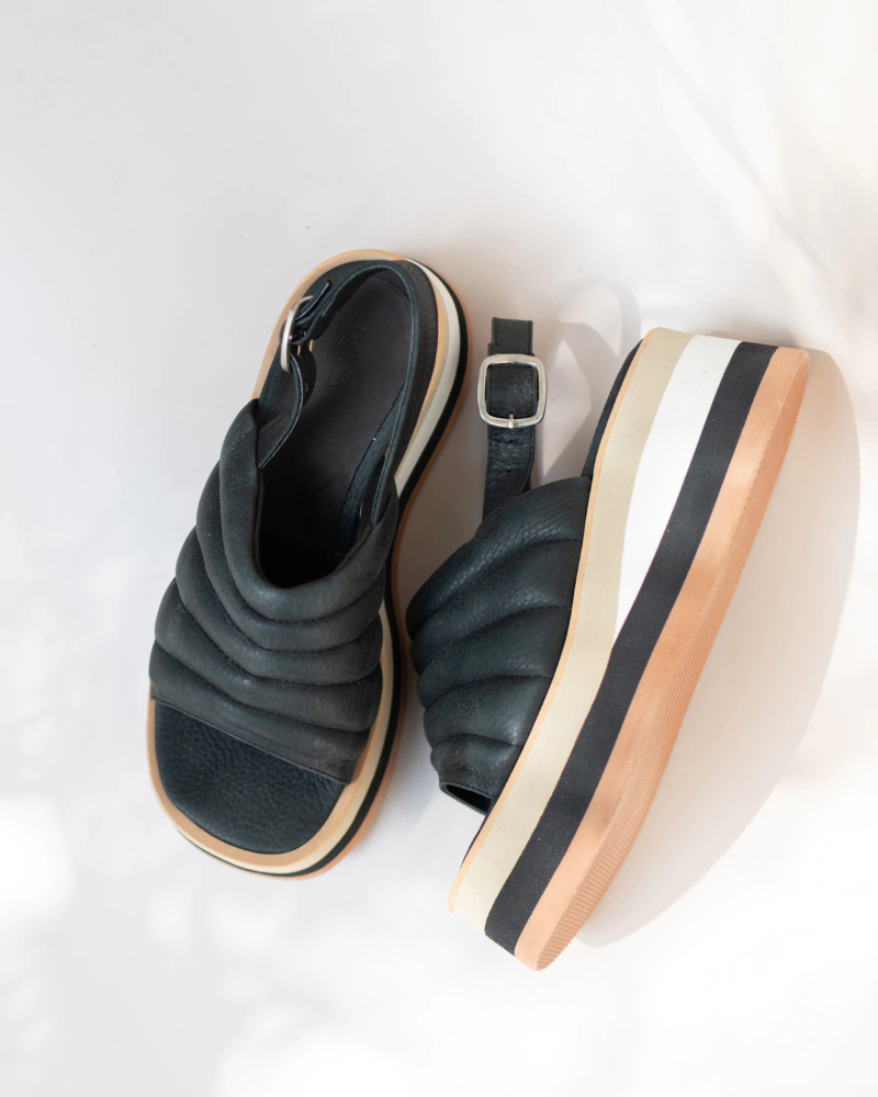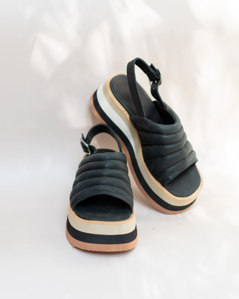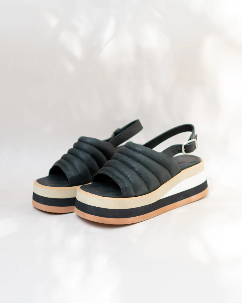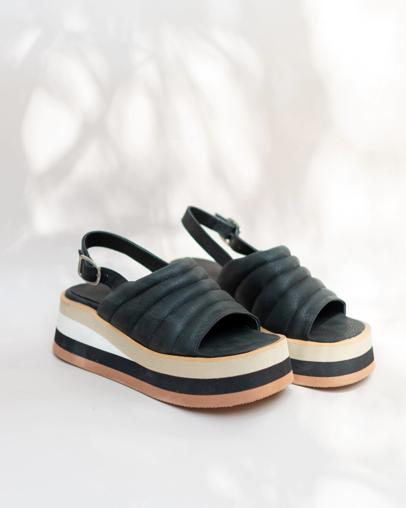 Sandalia matelaseada 100% cuero(capellada, forro y plantilla), color blanco. Base de eva a rayas, súper liviana, de 7cm.