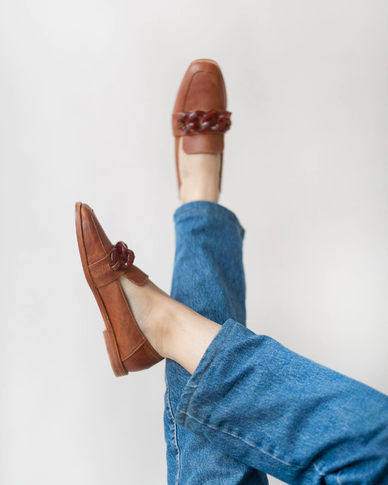 Mocasín 100% cuero, interior color suela, exterior color suela Con cadena de carey en el frente y punta cuadrada. Base artesanal de eva rutera con taco de 2 cm. Tienen un excelente calce y son super livianos. Cancheras, básicas, comodísimas. Industria 100% nacional.