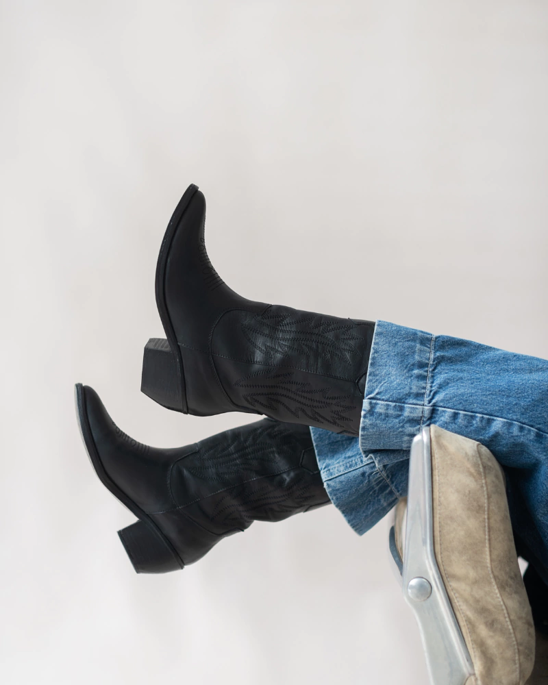 Las texanas infaltables para esta temporada!! 100% cuero vacuno, la forreria también. Bordado a tono en los laterales y la punta. Con taco de 5 cm de madera de color negro. Con antideslizante en la suela y el taco, para un andar super seguro. Caña de 26,5cm desde el talon. Súper comodas y divinas!!