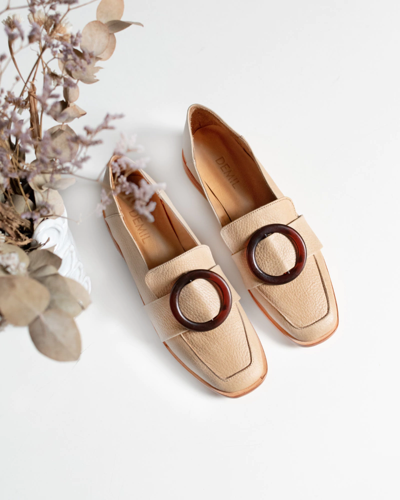 Mocasín 100% cuero, interior color brandy, exterior color brandy. Con hebilla marron en el frente, taco de un 1,5 cm y punta cuadrada. Con suelin punta de diamante en el taco, un excelente calce y muy livianos. Cancheras, básicas, comodísimas. Industria 100% nacional.