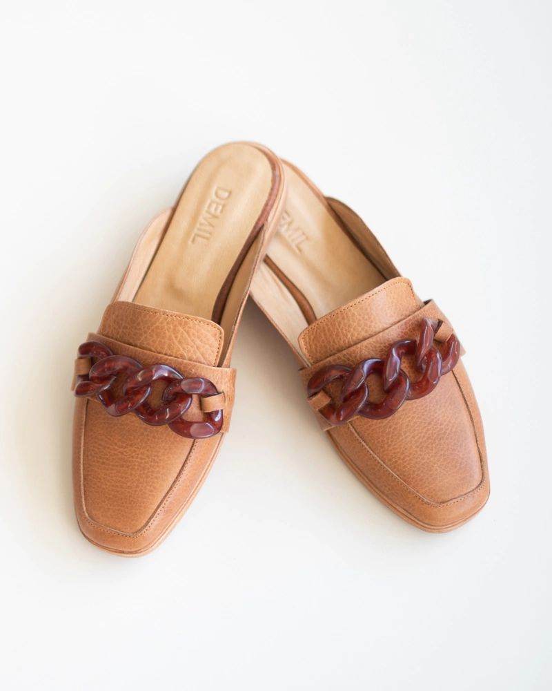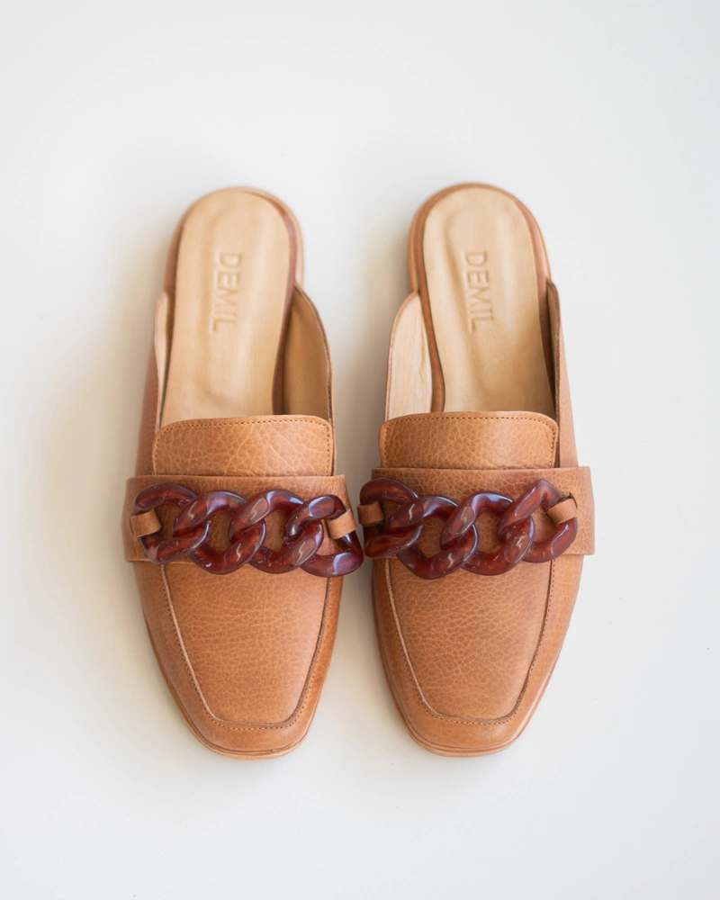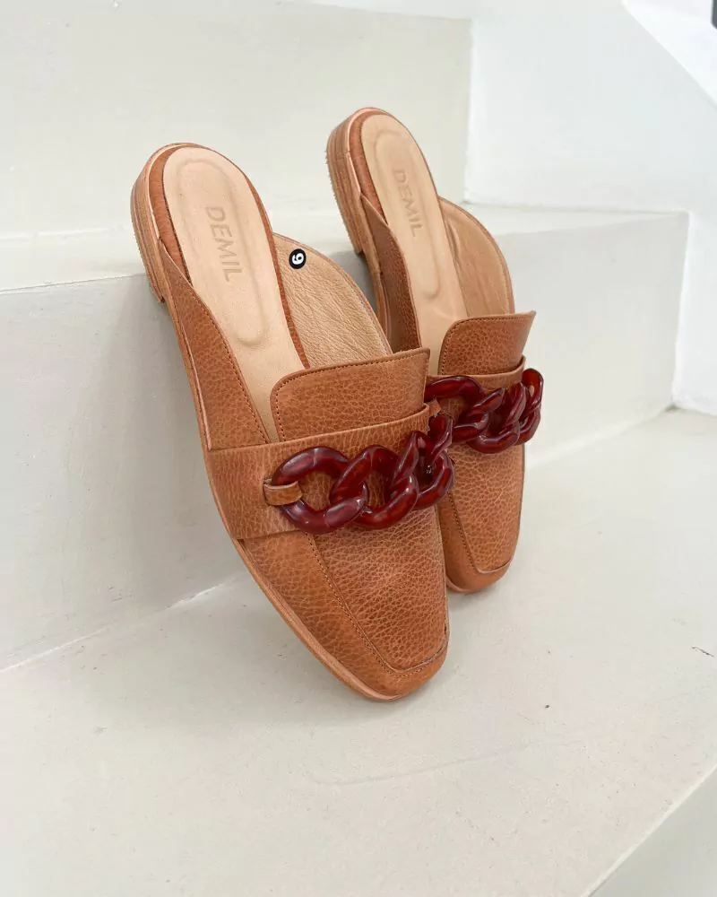 Zueco 100% cuero color suela. Taco de 1 cm, un excelente calce y muy livianos. Con cadena color bordo en el frente. Cancheras, básicas, comodísimas!